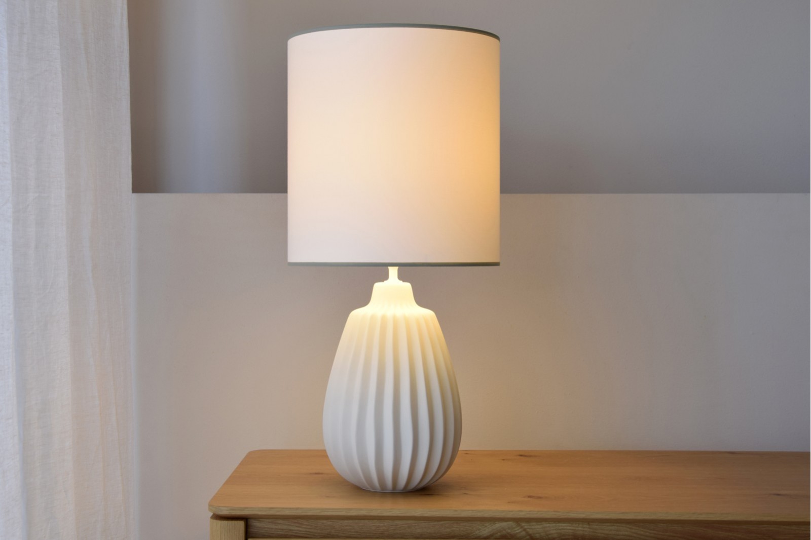 Lámpara sobremesa DOMO cerámica blanco mate texturado Vp Interiorismo, pantalla blanco roto vivos verdes