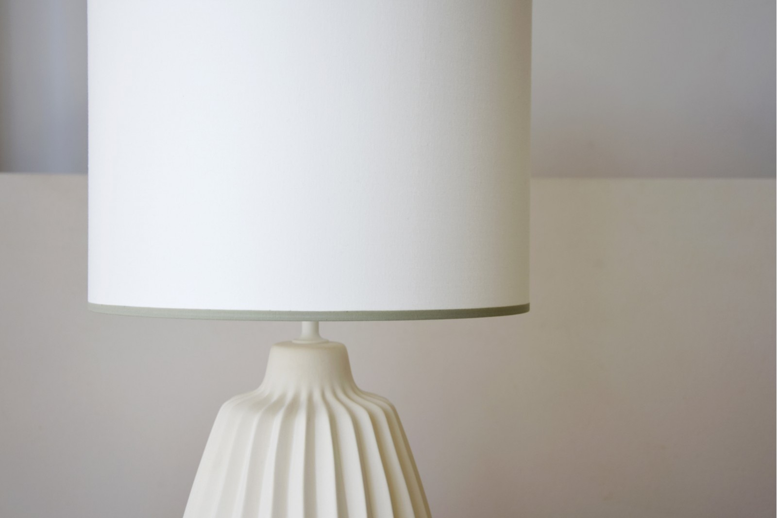 SE HA SELECCIONADO UNA PANTALLA CILÍNDRICA EN ALGODÓN BLANCO ROTO CON RIBETES EN VERDE LÍQUEN HACIENDO UN CONJUNTO EQUILIBRADO QUE COMBINA CON DISTINTO ESTILOS DE DECORACIÓN.
