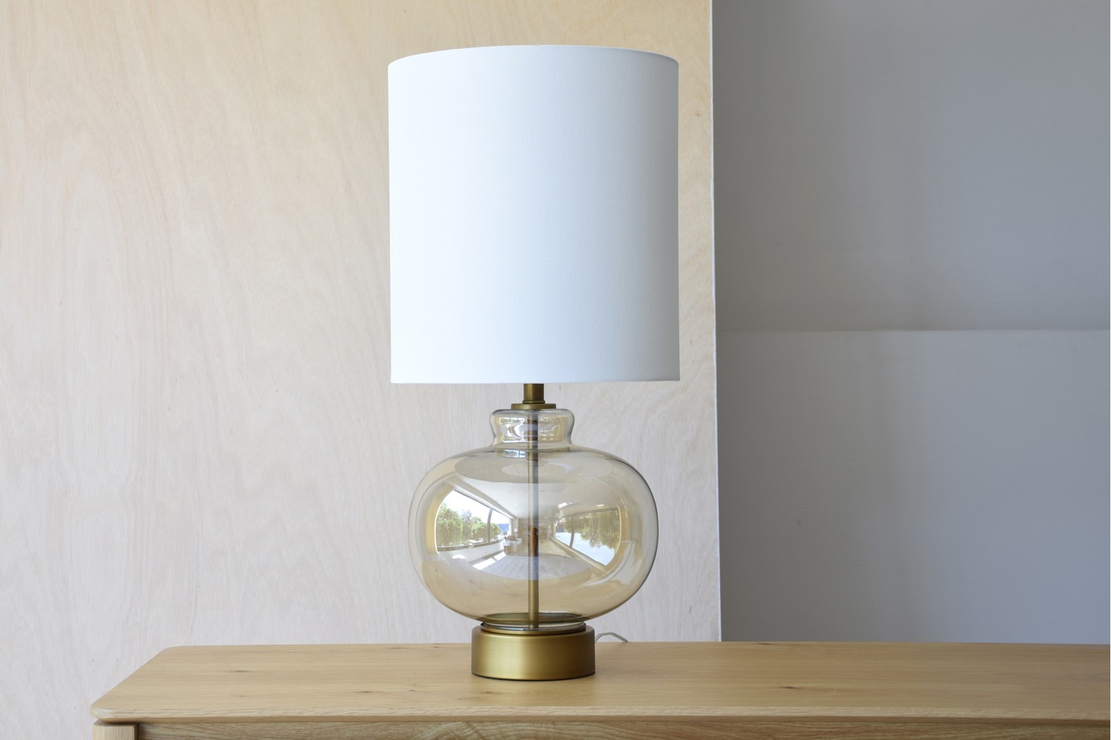 Lámpara sobremesa ORBE de vidrio cristal ámbar con pie y detalles cuero VP Interiorismo, con pantalla lino blanco.