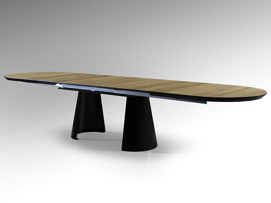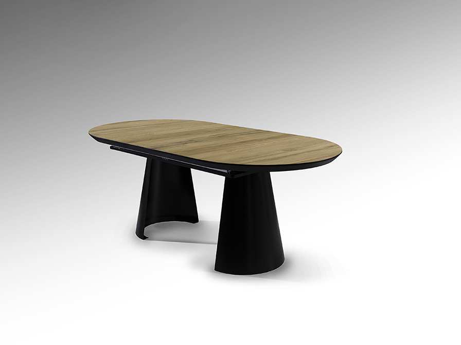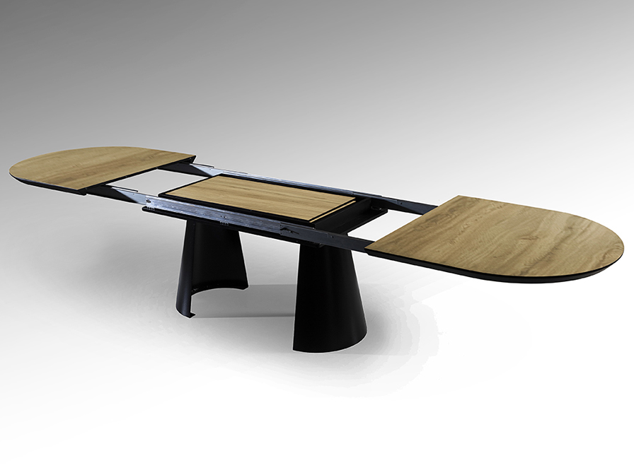 Mesa de comedor extensible, realizada en metal acabado negro mate y tapa de DM con superficie melaminica de alta resistencia, acabado madera, con cantos en negro mate.