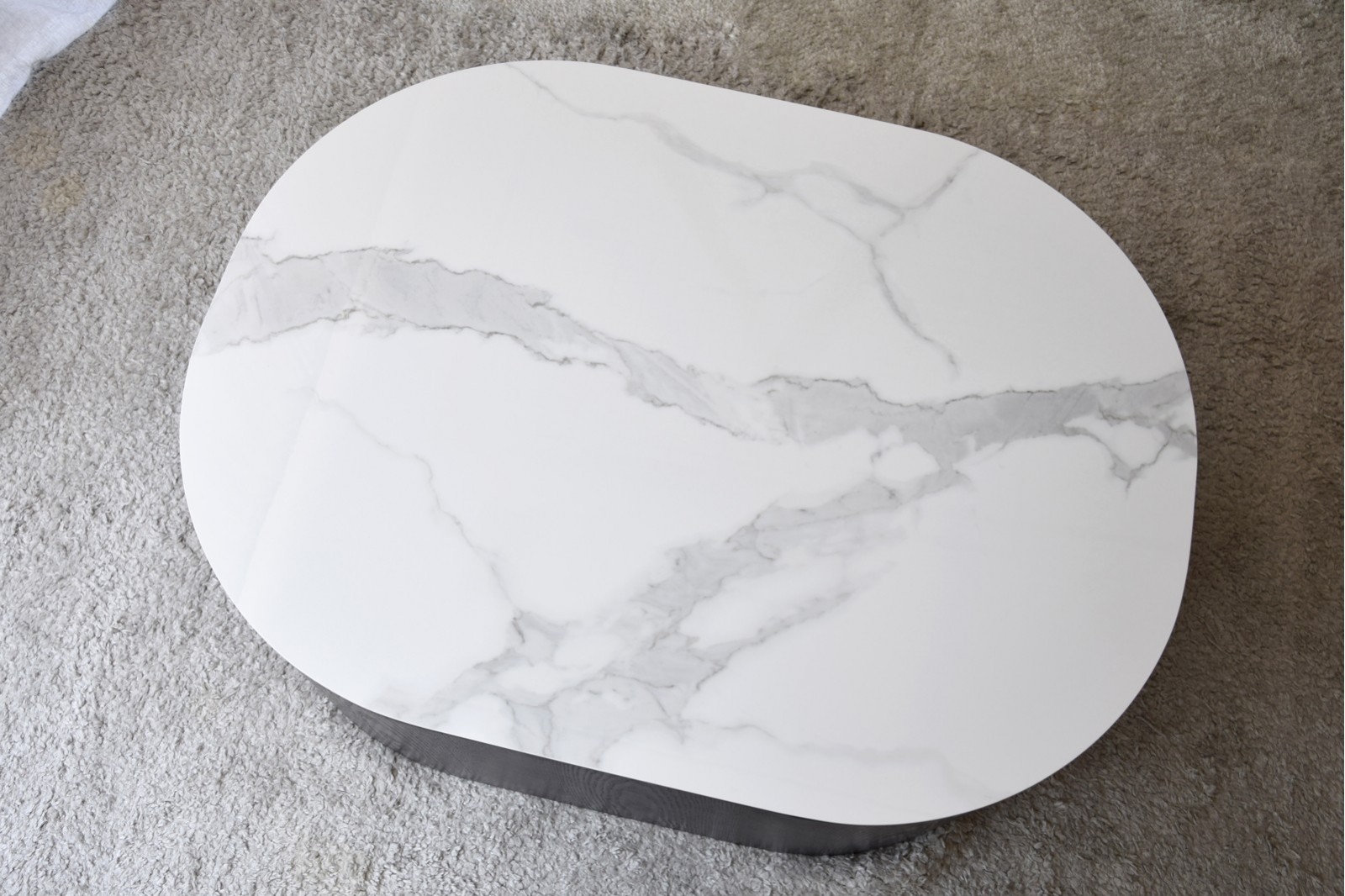 MESA DE CENTRO  DE SOBRE REALIZADO EN MATERIAL CERÁMICO DE 12 MM DE ESPESOR DE ACABADO MÁRMOL EN COLOR BLANCO VETEADO EN TONOS GRISES.