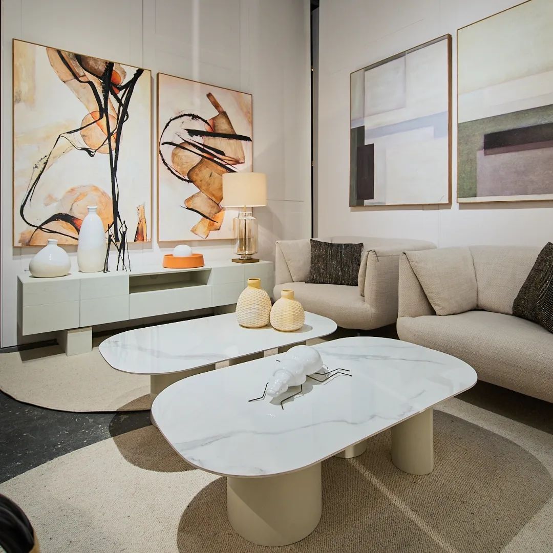MESA DE CENTRO CON SOBRE DE FOMA SEMI-OVAL REALIZADO EN MATERIAL CERÁMICO DE 12 MM DE ESPESOR CON ACABADO MÁRMOL EN COLOR BLANCO VETEADO EN TONOS GRISES.