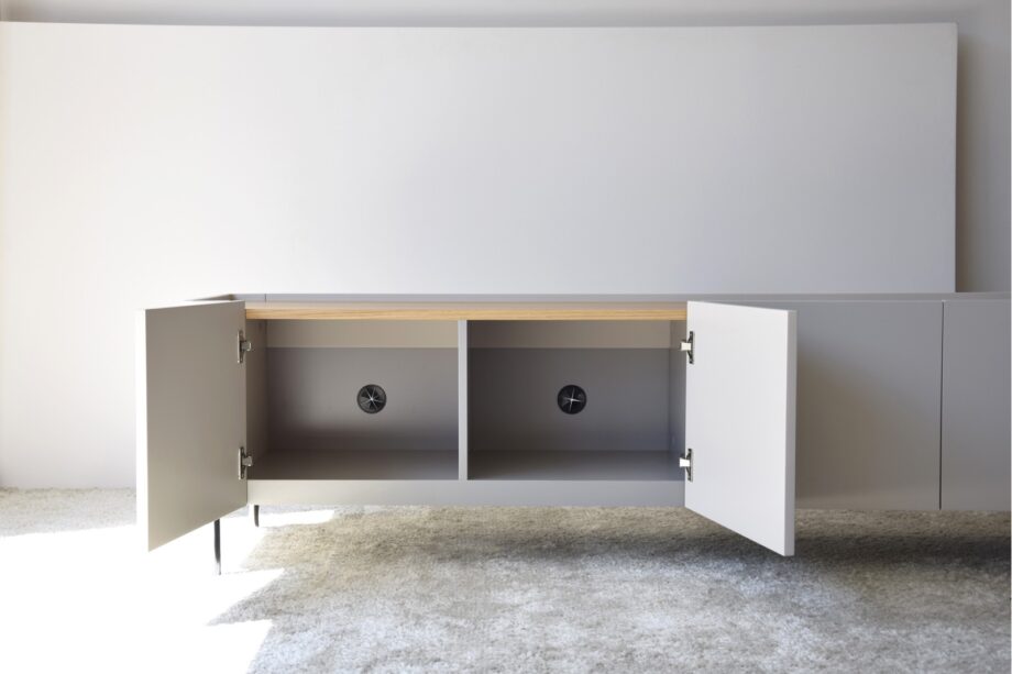 MUEBLE DE TELEVISIÓN REALIZADO EN DM LACADO EN TONO GRIS ARENA CON ACABADO MATE Y PARTE SUPERIOR RECHAPADA EN MADERA DE ROBLE NATURAL.