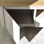 MUEBLE DE TELEVISIÓN REALIZADO EN DM LACADO EN TONO GRIS ARENA CON ACABADO MATE Y PARTE SUPERIOR RECHAPADA EN MADERA DE ROBLE NATURAL.