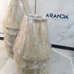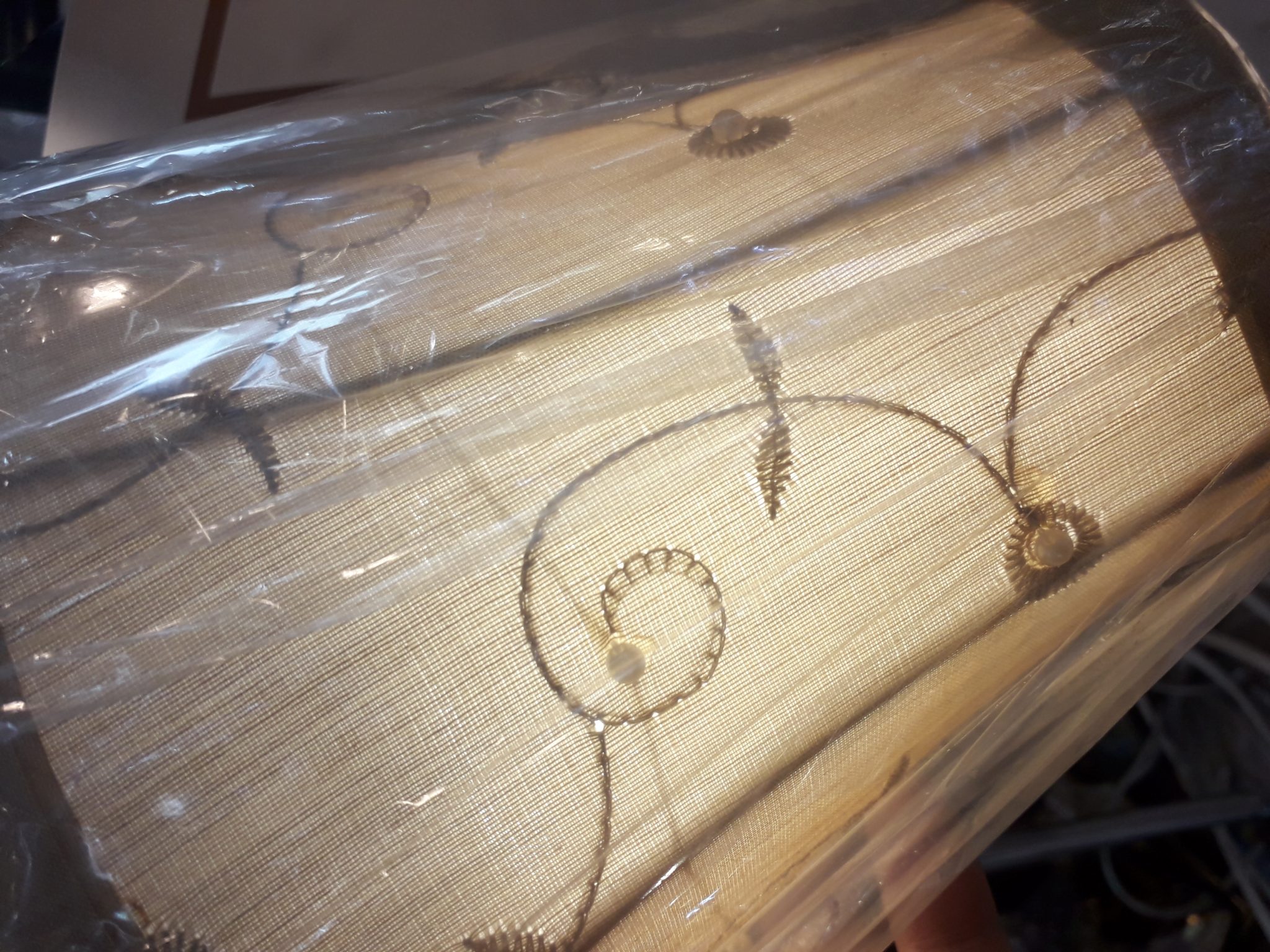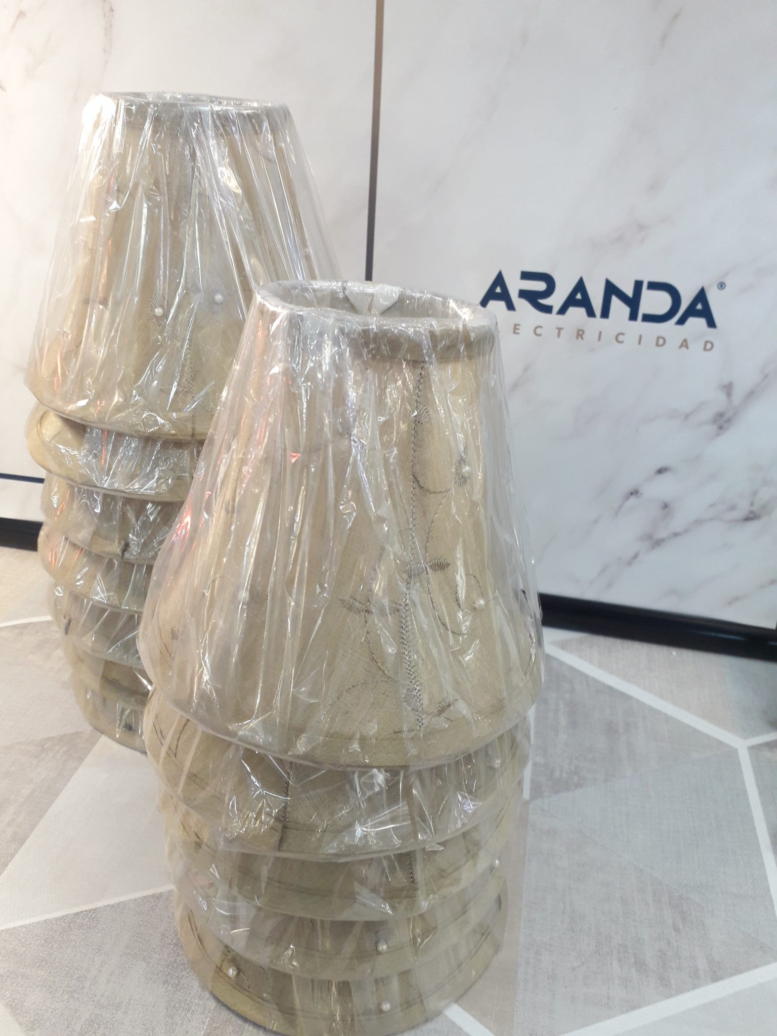 Pantalla alta tela tostada con forma pagoda, bordada y con pequeñas perlitas blancas cosidas con forro interior blanco.