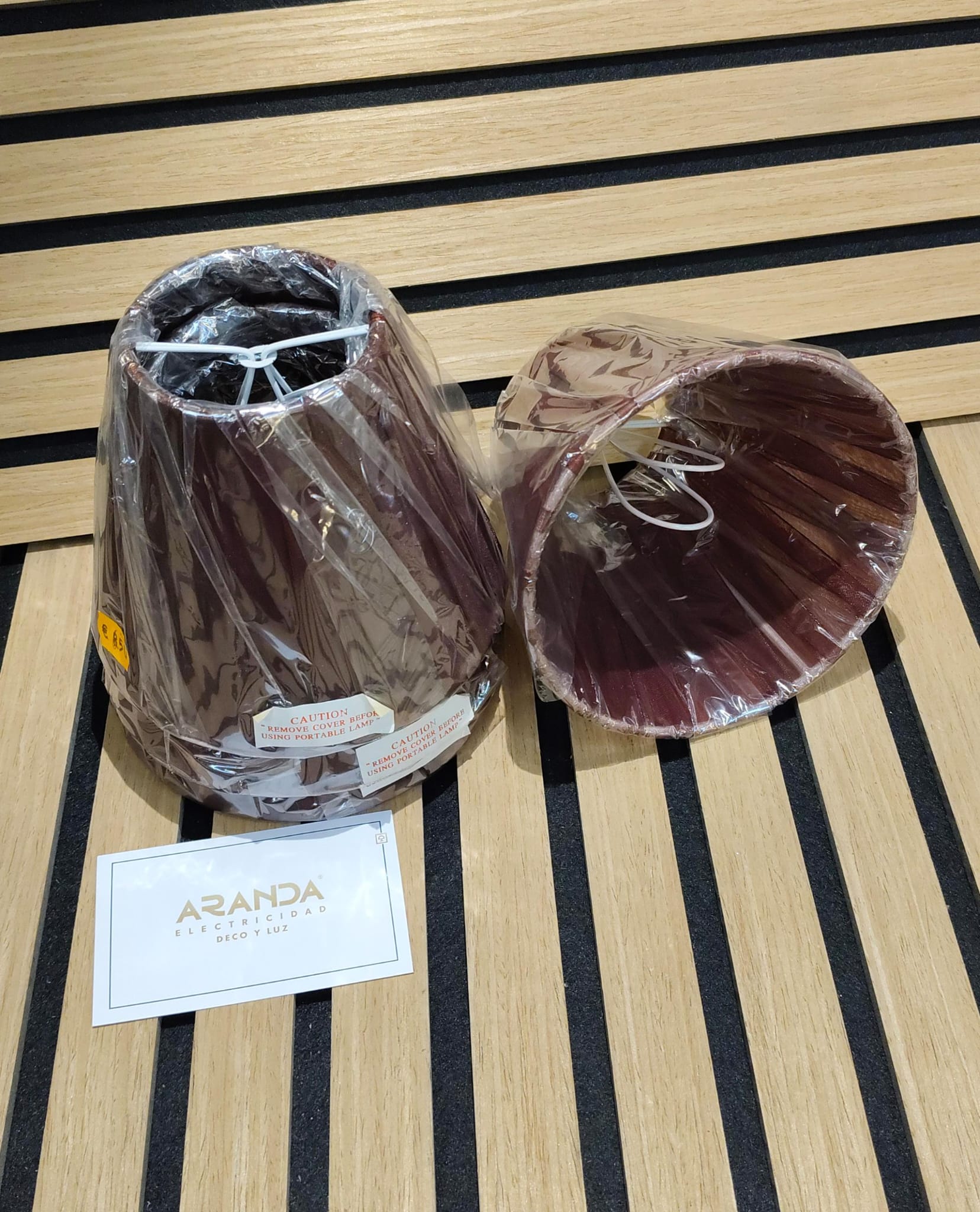 Pantalla organza en tela tableada marrón sin forro por lo que deja pasar luz.