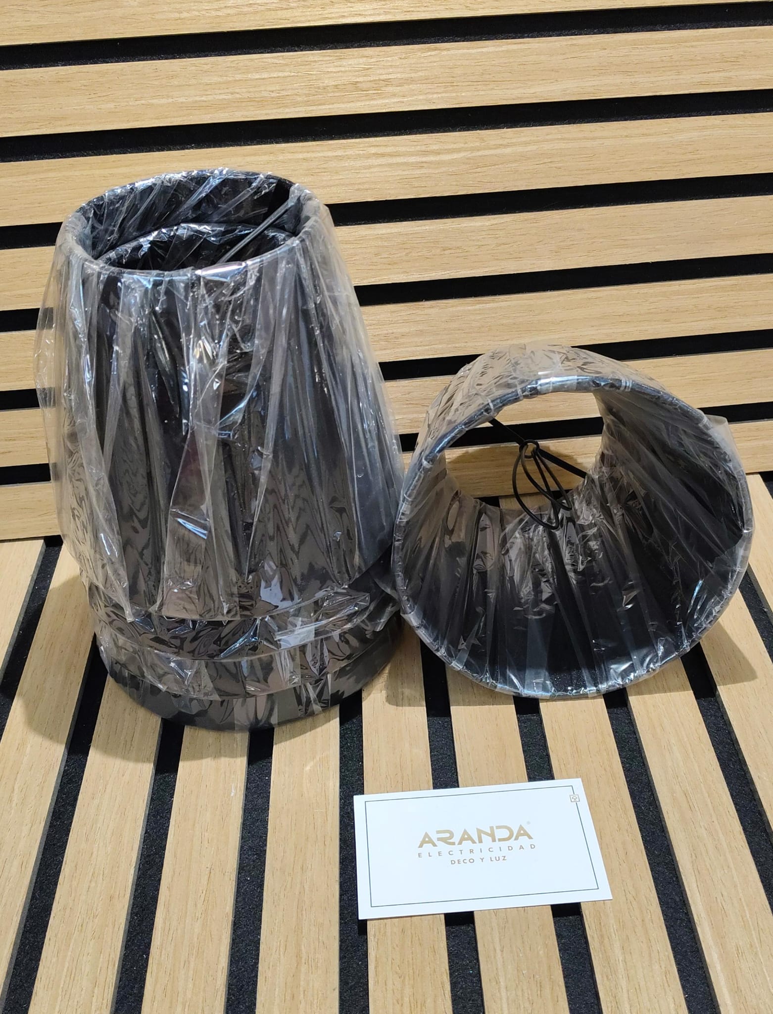 Pantalla organza en tela tableada negra sin forro por lo que deja pasar luz.