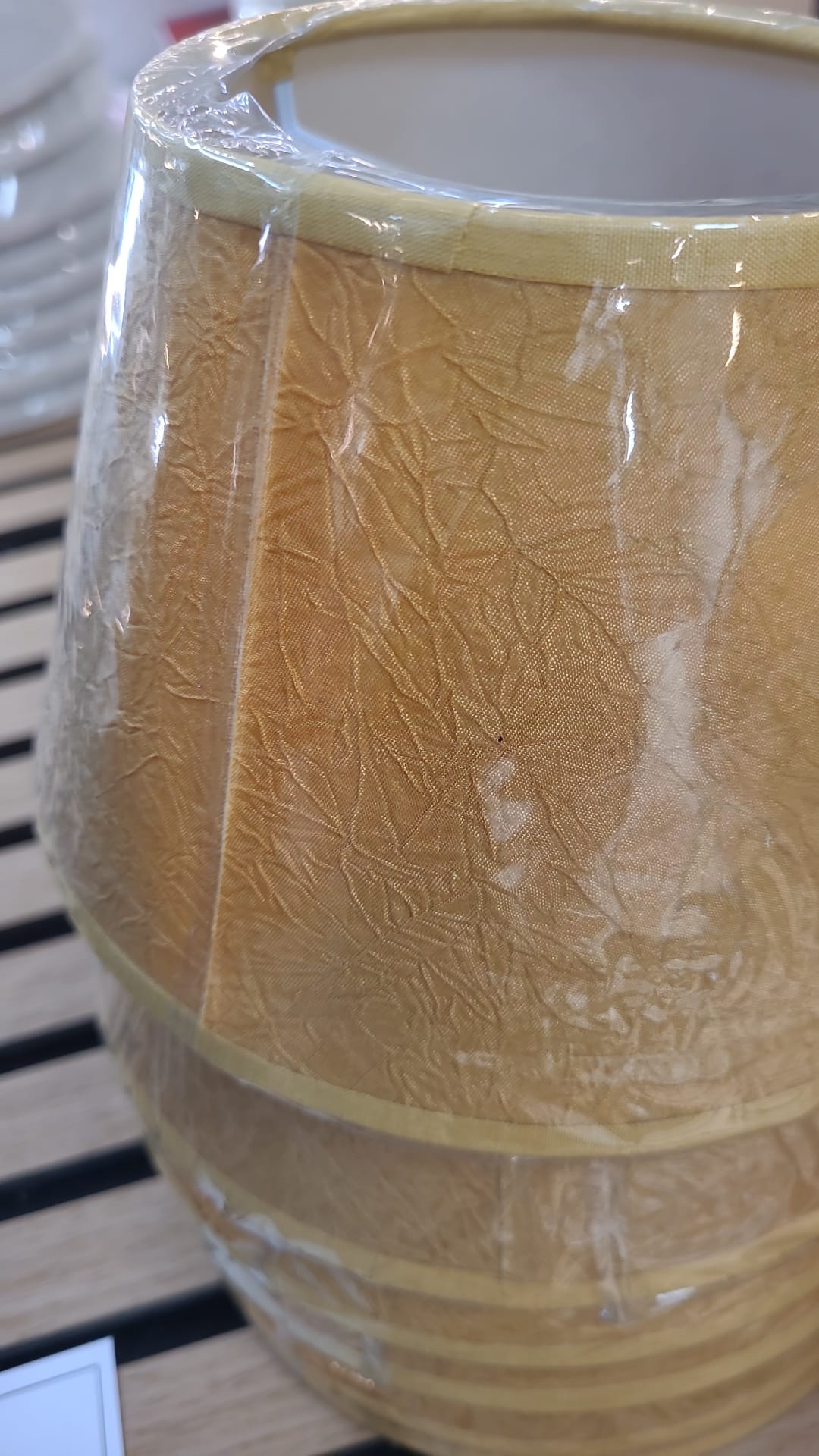 Pantalla en tela crema amarilla con interior forro blanco.