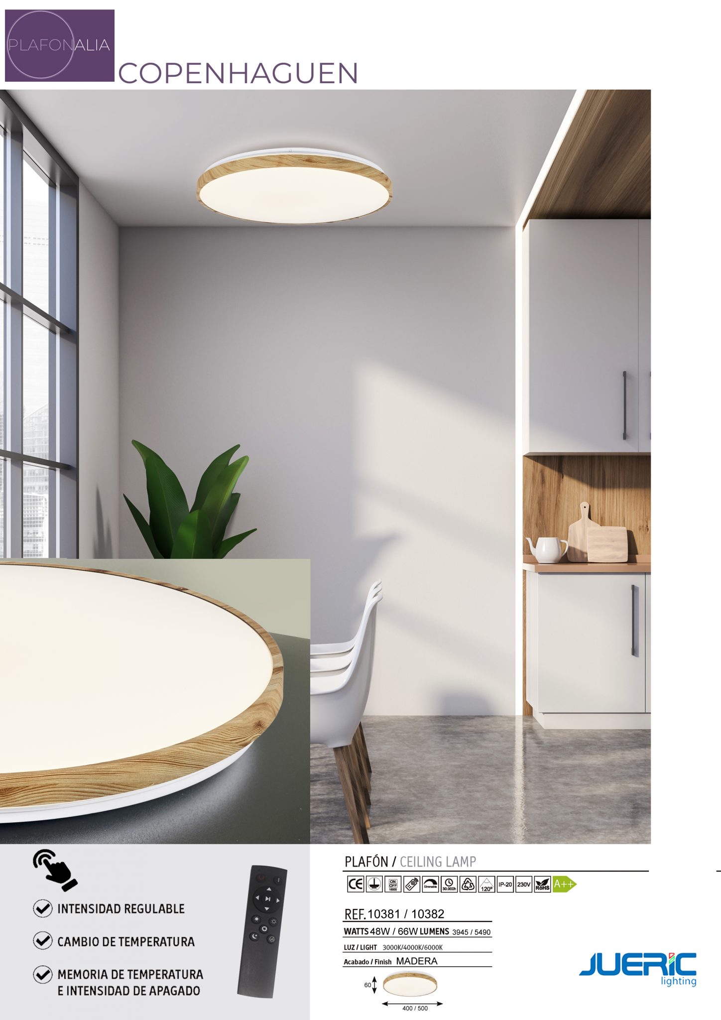 COPENHAGUEN: Plafón blanco con perfil color madera, 66W Led, dimable con mando a distancia 3k 4k 6k, 10382 Jueric. 50cm.