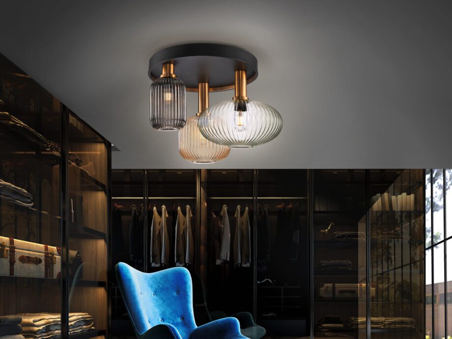 Plafón NORMA de base negra con 3 tulipas de cristal transparente smoke y fumé