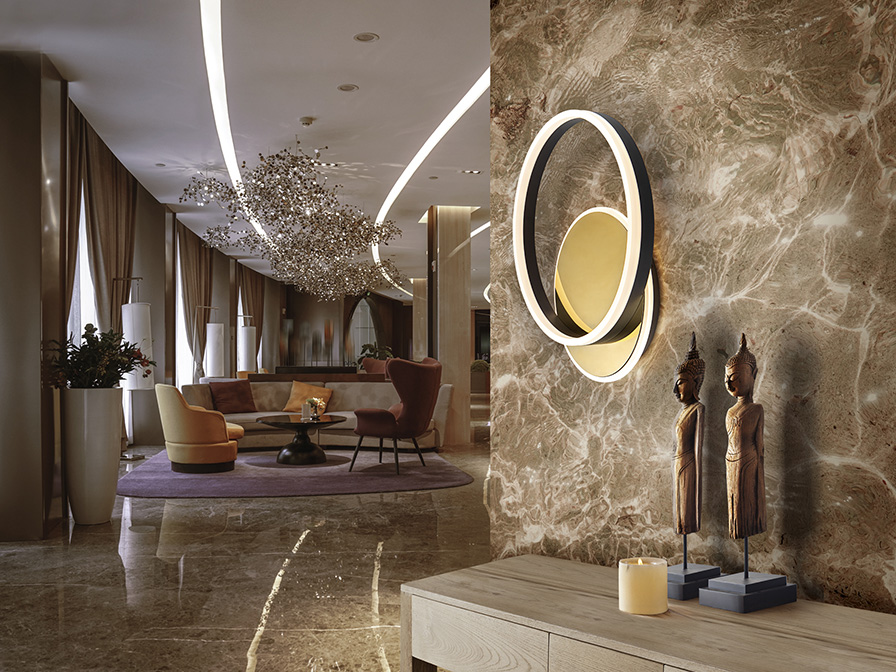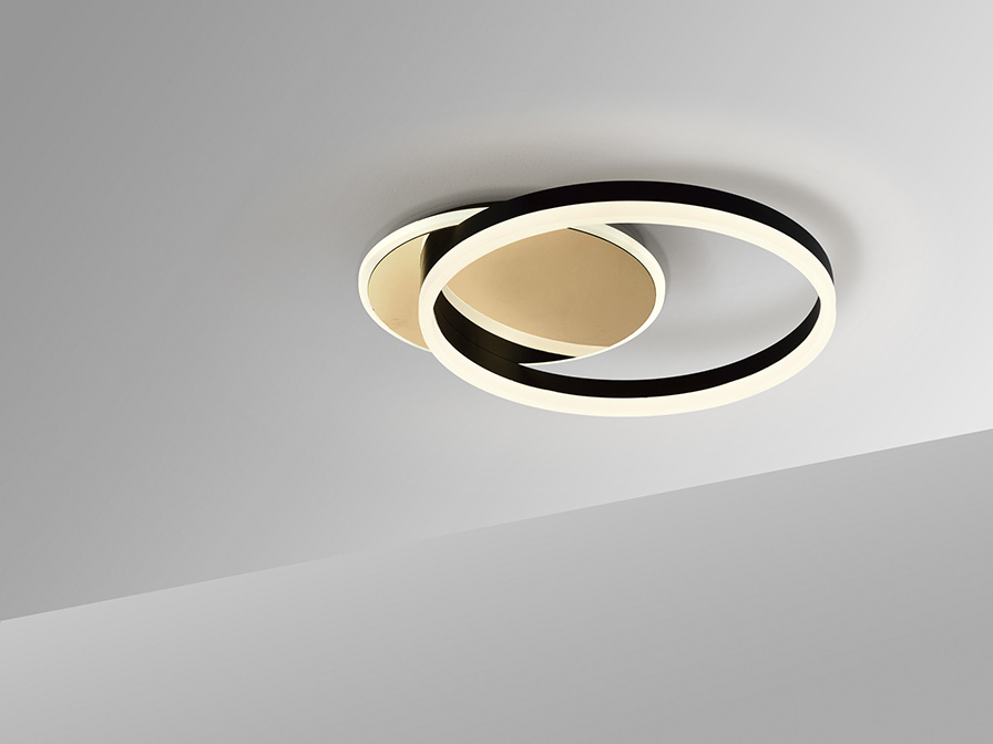 Plafón realizado en acero acabado oro y aluminio acabado negro mate.