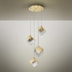 Lámpara de 4 luces, realizada en metal y acero acabado ORO. Tulipa cúbica de cristal texturizado. Regulable en altura.