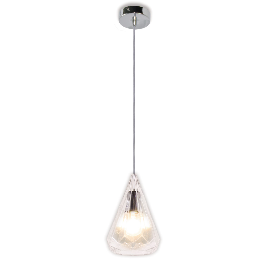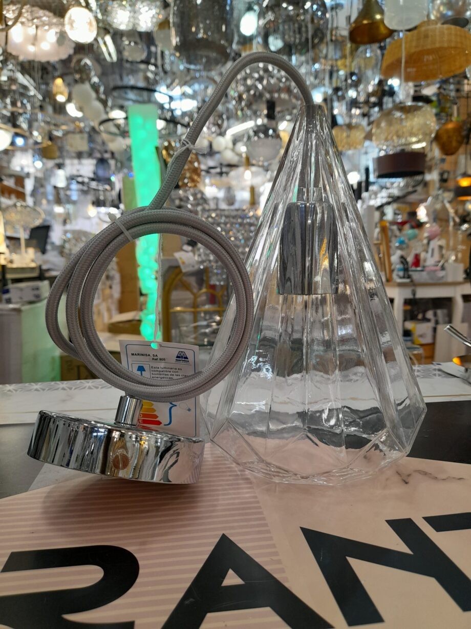 Cristal piramidal con instalación de cable textil gris con metal en terminación cromo brillo.