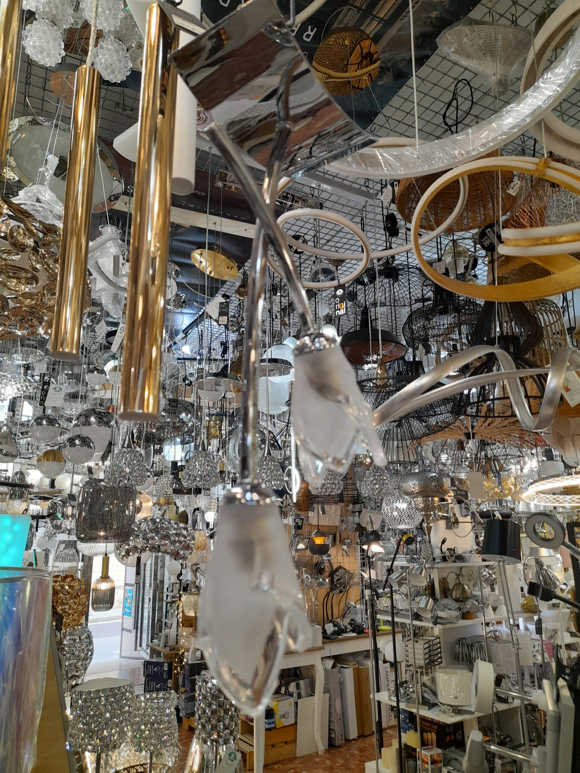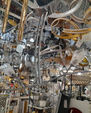 Una elegante gama de varillas infinitas de cromo pulido y pantallas compactas de cristal floral esmerilado.