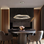Lámpara realizada en metal cromado, con aro de acrílico transparente tallado. Regulable en altura. Iluminación LED 37W, 3100lm, 3.000K.
