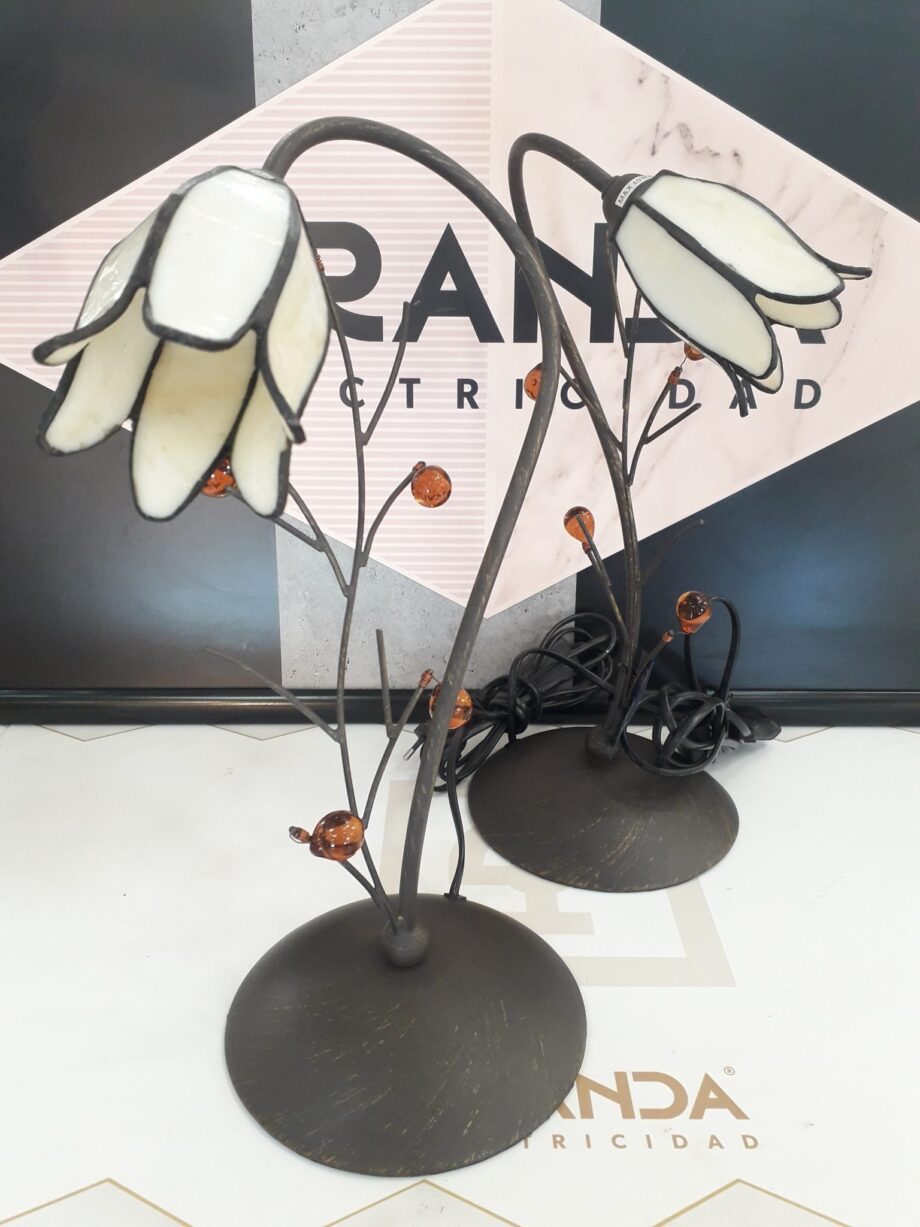 Set de dos sobremesas forja marrón envejecida con lágrimas de cristal ámbar y tulipa artesana tiffany.