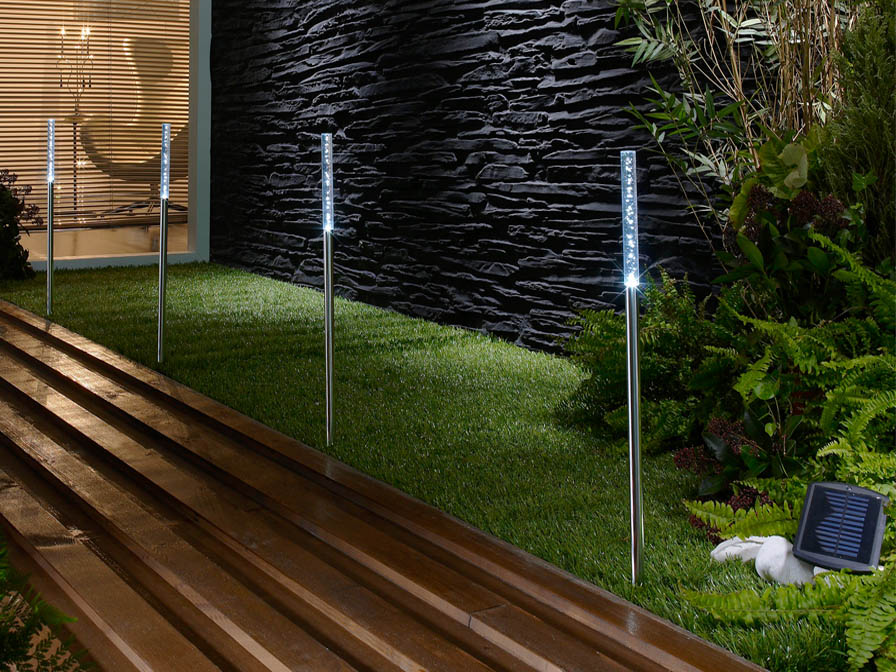 Balizas con forma de varillas de luz, realizadas en acero inoxidable y metacrilato.