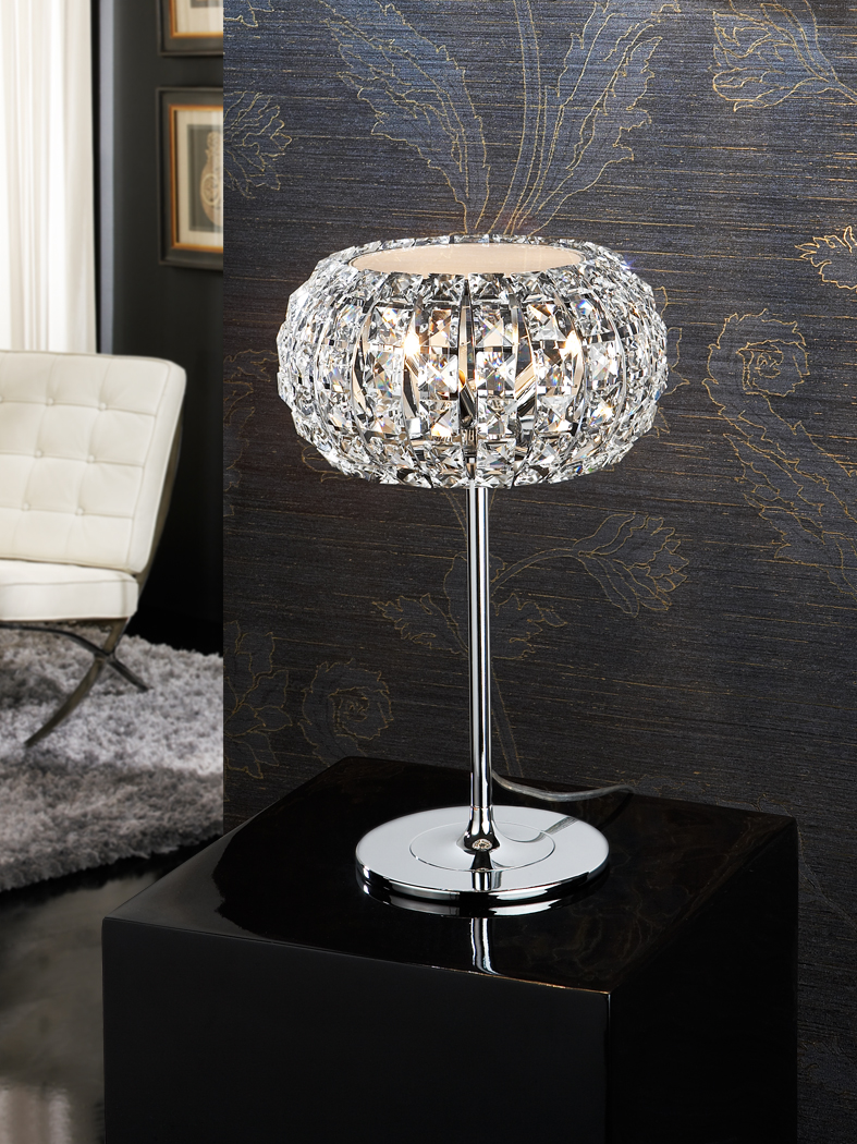 Lámpara sobremesa de 3 luces realizada en metal acabado cromo. Tulipa compuesta por copens cuadrados de cristal transparente. Incluye difusor superior de cristal opal.