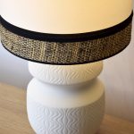 Lámpara sobremesa EVA pequeña cerámica Vp Interiorismo, pantalla algodón blanco y rafia con vivos negros