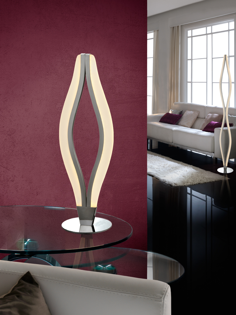 Lámpara sobremesa de iluminación LED, realizada en metal y aluminio. Acabado cromo. Difusor acrílico.