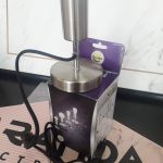 Lámpara de mesa níquel satinado con interruptor negro de cable.