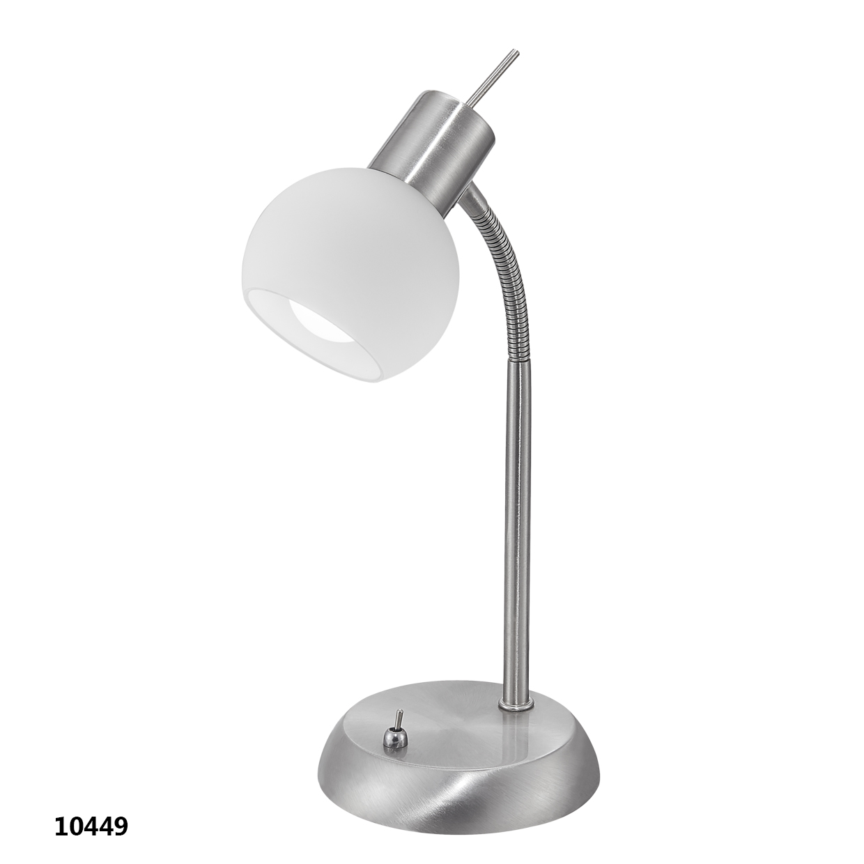 Sobremesa metálica níquel satinado con tulipa de cristal blanca Opal, portalámparas E14 máximo 60w, compatible con bombilla Led.