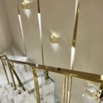 Pantalla de prismas de cristal facetado con remate de piezas de abs acabado en baño dorado.