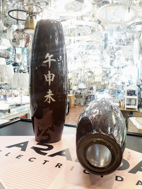 Tulipa cristal marrón con Letra china en contraste blanca.