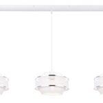 3 colgantes en blanco y 2 aros cromados plateados, la pantalla consiste en una malla de alambre curvada.