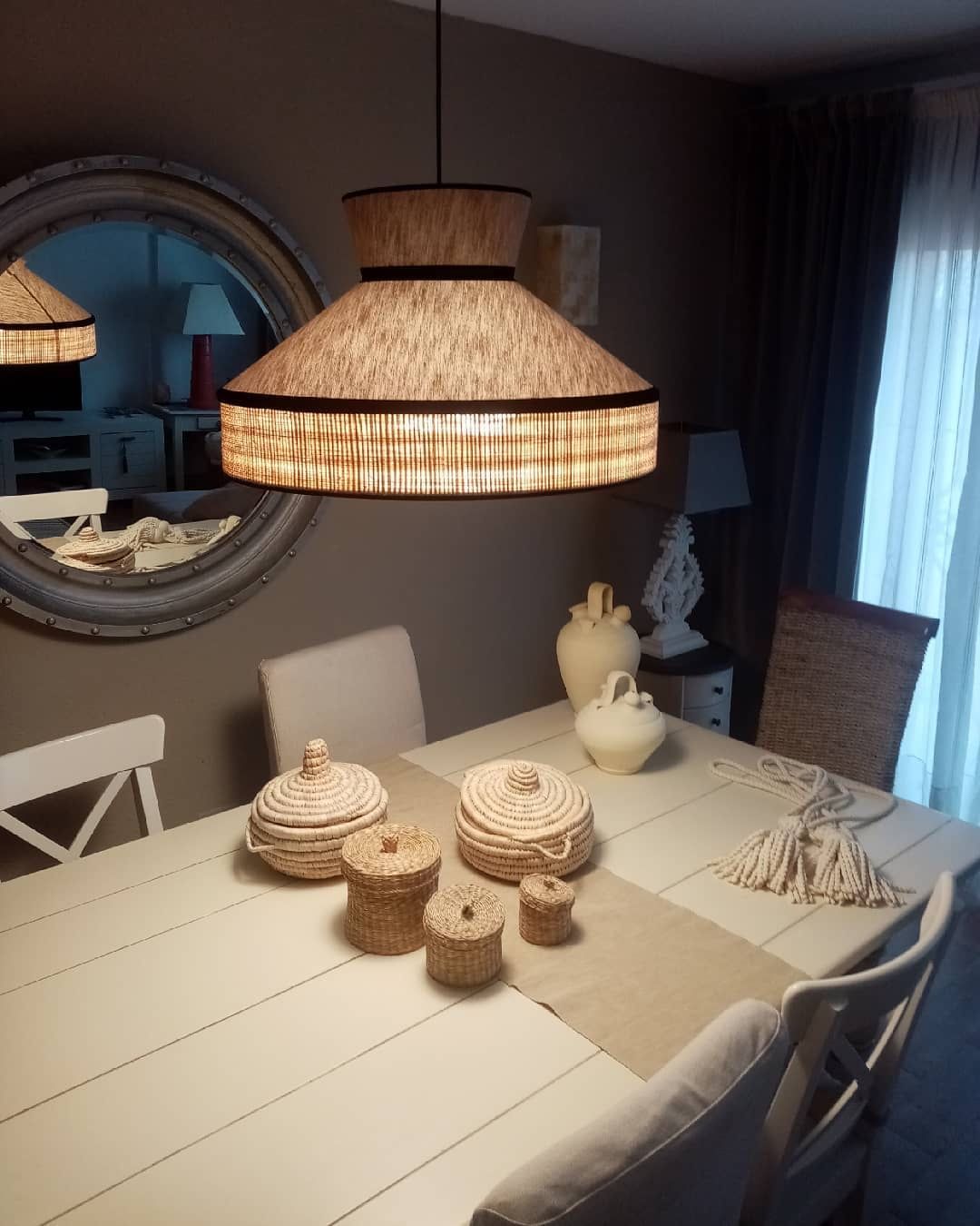 Colgante de pantalla en varios volúmenes, con tela Neptuno color piedra y Banana,  material imitación a rejilla con textura, con vivo negro.