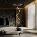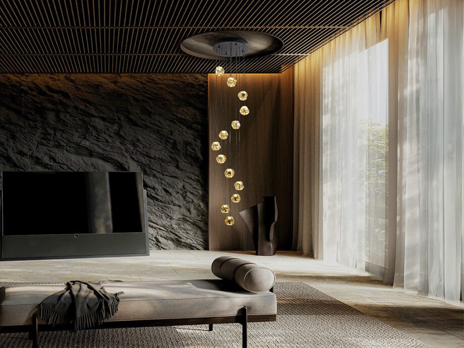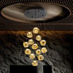 Lampara de 13 luces, realizada en metal acabado negro mate con detalles en bronce y tulipa de acrílico ámbar.